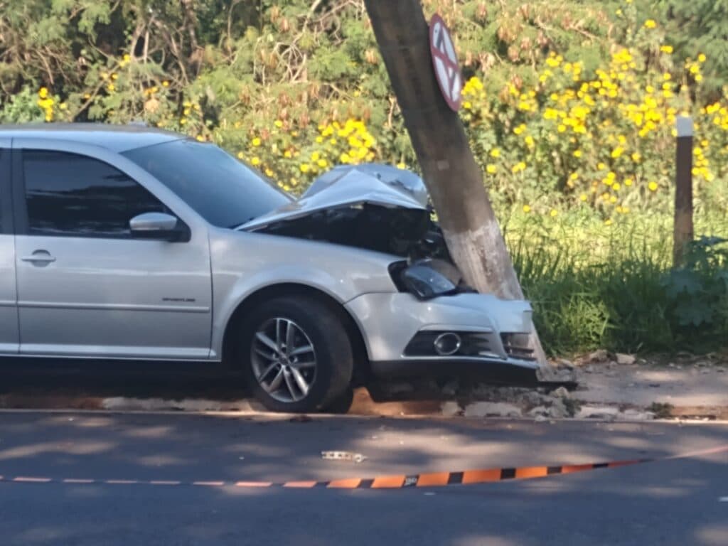 Motorista cochila ao volante, atravessa avenida e arrebenta carro em poste