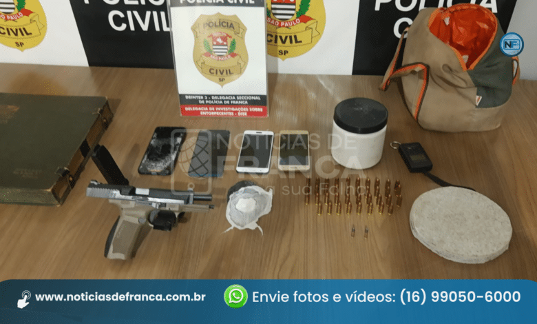 Durante a revista no imóvel, foram localizados outros três aparelhos celulares, cartões bancários, balança de precisão, cocaína, um pó branco utilizado como mistura aos entorpecentes, uma pistola calibre 9mm, duas munições calibre 22 e uma pasta contendo discos de vinil. A companheira do detido assumiu a propriedade da arma de fogo.