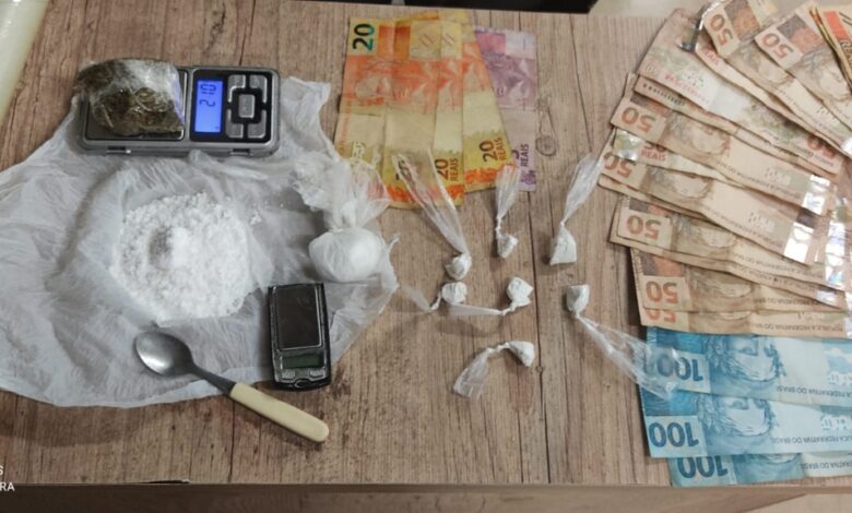 Durante a revista pessoal foram localizadas 7 porções de cocaína e R$ 65 em dinheiro em posse do homem. Questionado o indivíduo confessou que estava vendendo cada porção por R$ 30 e informou que em sua residência havia mais drogas. A equipe se deslocou até a residência do traficante e no quarto do indivíduo foram localizados 50 gramas de cocaína, 22 porções de maconha, duas balanças de precisão, materiais para embalar a droga e mais R$1.060,00.