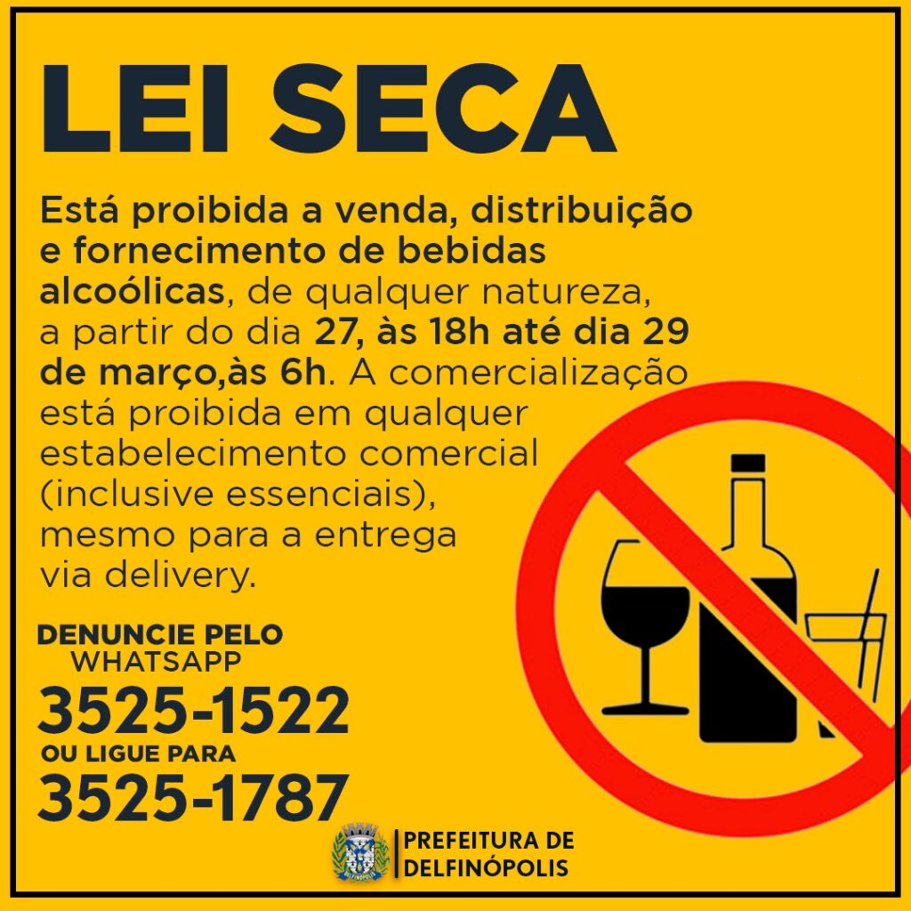 Para coibir festas e reuniões clandestinas na cidade, a Prefeitura de Delfinópolis (MG) proibiu a venda de bebidas alcoólicas entre as 18 horas deste sábado, 27, até às 6 horas de segunda-feira, 29. Nem mesmo a comercialização por delivery é permitida.