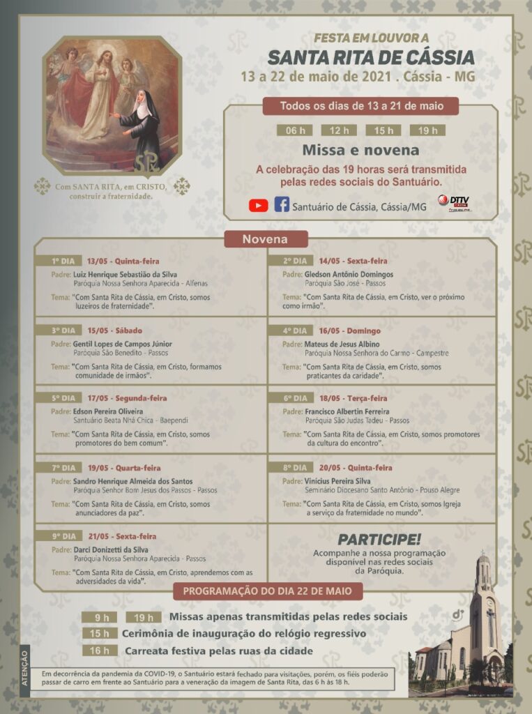 “Mais um ano somos forçados, devido à pandemia, a celebrarmos Santa Rita de Cássia de forma atípica, salvaguardando a vida e seguindo rigorosamente as prescrições dos órgãos de saúde no combate ao coronavírus. Dessa forma, sabendo do carinho e da devoção do nosso povo à Santa dos Impossíveis, que ama e deseja sempre recorrer ao nosso santuário nesses dias especiais de maio, como forma de prevenção e de cuidado, as celebrações em dois dias serão apenas transmitidas pelas redes sociais”, explicou o pároco, padre Julio Cesar Agripino.
