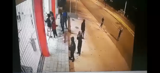 Dez homens encapuzados foram flagrados pelas imagens das câmeras de segurança forçando as grades. Eles não conseguiram invadir a loja e vão embora. Minutos depois, os criminosos retornam, jogam uma substância inflamável e ateiam fogo na loja.