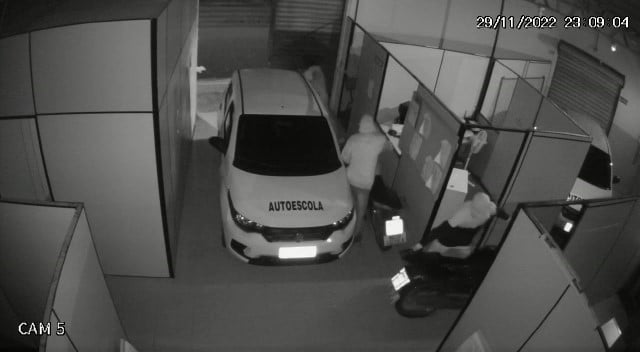 Nas imagens, três bandidos encapuzados saem de uma mata próxima à autoescola e vão em direção do estabelecimento. Com um pé de cabra, um dos criminosos arromba a porta e o trio invade o local. Com as lanternas dos celulares eles vão até uma sala e pegam as chaves das motocicletas em uma gaveta, retiram as motocicletas do local e fogem.
