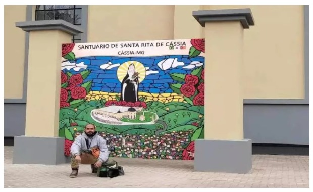 Um desenho forte e alegre que destoa um pouco da pintura sacra, porém reforça a tradição da simplicidade e alegria dos fiéis que alcançam suas graças por intercessão da advogada das causas impossíveis. “Fiquei muito feliz com o convite de pintar no Santuário. Além de ser importante afetivamente pra mim, que sou cassiense, cresci envolto na cultura e religiosidade de Santa Rita de Cássia. Vejo este trabalho como um marco na minha carreira artística”, finaliza.