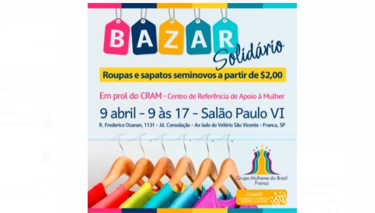 Solidariedade, ato de bondade e compaixão pelo próximo. É assim que podemos definir o trabalho das voluntárias do Grupo Mulheres do Brasil de Franca. E elas não param! Agora, por meio do Comitê Niara de Combate à Violência Contra a Mulher, o Grupo vai realizar um bazar solidário de roupas e sapatos novos e usados em prol do Cram (Centro de Referência de Atendimento à Mulher). O evento será nesse sábado, dia 09 de abril, das 9h às 17h, no salão Paulo VI, na rua Frederico Ozanan, 1131 – Jardim Consolação; ao lado do Velório São Vicente de Paulo. Não percam a oportunidade de adquirir peças novas e usadas – mas bem conservadas – a partir de R$ 2. Parabéns a todas as voluntárias do Grupo Mulheres do Brasil de Franca pela iniciativa!