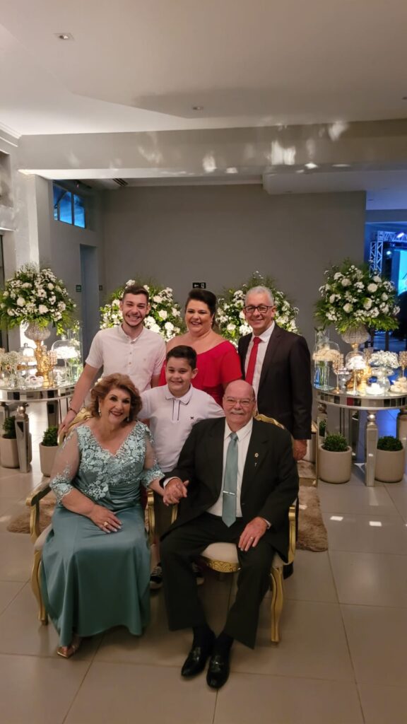 O termo boda tem sua origem a partir do latim “vota” / “votum”, que pode ser traduzido literalmente como “promessa”. E o casal Rubens Leite e Rosa Leite renovaram suas promessas de 50 anos de casados no dia 20 de janeiro, celebrado na Igreja Santa Edwiges, na presença de amigos e famiares. Logo em seguida, o casal recebeu seus convidados em uma linda recepção no Spazio Buffet. Na foto, o casal está com uma de suas filhas, Juliana, e o genro, o advogado Acir Mattos, além de seus netos Gabriel e Rafael .
