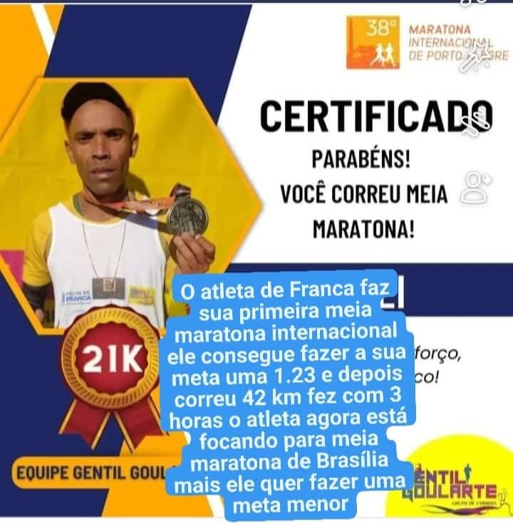 O atleta de Franca Edson Bezerra de Medeiros, que tem o apoio desta Folha de Franca, participou de sua primeira meia maratona internacional, a de Porto Alegre, e ficou feliz com o resultado. Ele conseguiu atingir sua meta e completou a prova de 21k em 1h23m. No dia seguinte, ele correu a maratona inteira em 3 horas, totalizando 63 km em dois dias. O atleta agora está focado na meia maratona de Brasília. Boa sorte, Edson!