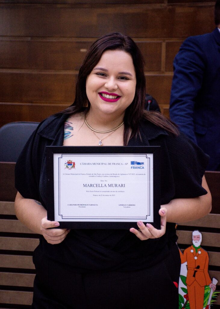 A jornalista Marcella Murari foi homenageada com uma moção de aplausos pela Câmara Municipal de Franca na última sessão, dia 28 de março, pelo primeiro ano do Zoom Podcast e por seus 13 anos de carreira. A autoria é da vereadora Lindsay Cardoso e a moção foi aprovada por unanimidade.