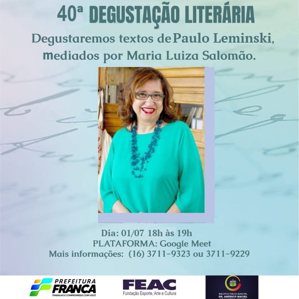 Para os amantes da literatura, está chegando a 40ª edição da Degustação Literária. Mediado pela querida Maria Luiza Salomão, todos os presentes degustarão textos de Paulo Leminski, no dia 1 de julho, das 18 às 19 horas, na plataforma Google Meet. Para mais informações: (16) 3711-9323 ou (16) 3711-9229.