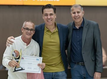 O momento se tornou ainda mais especial ao receber o troféu das mãos do técnico campeão do Franca Basquete, Helinho, símbolo de dedicação e sucesso no cenário esportivo nacional.