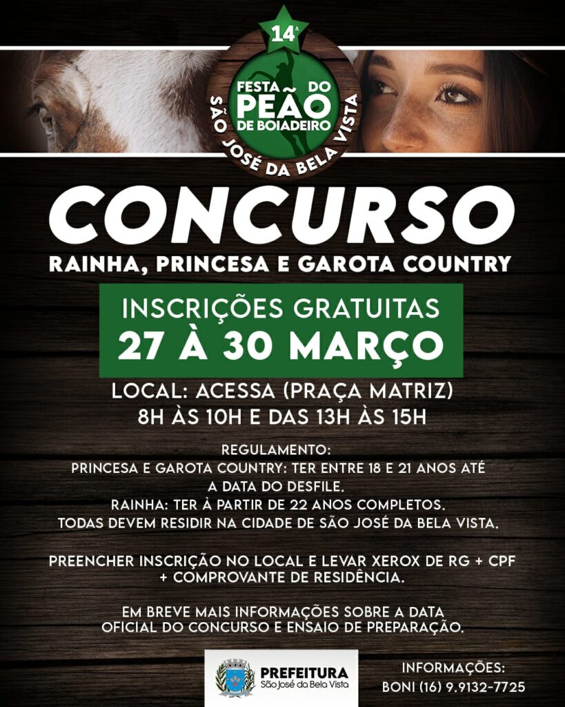 O prefeito Walter Cássio anunciou essa semana a abertura das inscrições para o concurso da escolha da Rainha, Princesa e Garota Country da 14ª Festa de Peão de Rodeio de São José da Bela Vista. Após 12 anos sem festa de peão, o prefeito decidiu reavivar o tão esperado Baile da Rainha da Festa de Peão. As garotas interessadas em participar do concurso da Princesa e Garota Country têm que ter de 18 a 21 anos, e as candidatas a Rainha deverão ter acima de 22 anos. As inscrições começam nesta segunda feira, dia 27 de março, e vão até dia 30 de março, no pavilhão do acesso ao lado da Igreja da Matriz de São José da Bela Vista. Lá é só falar com a Bombom e levar xerox do RG e comprovante de endereço no ato da inscrição. Parabéns a toda comitiva da 14ª festa de peão de São José da Bela Vista e ao prefeito Walter Cássio e Maria Luiza.