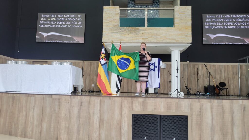 Pastora Mirian de Carvalho, líder regional do segundo campo do Evangelho Quadrangular, mulher de oração, querida, amada e respeitada na cidade de Franca e região pelos trabalhos realizados em favor ao próximo, aparece na foto em um momento maravilhoso, no culto, orando e intercedendo pela Nação Brasileira.