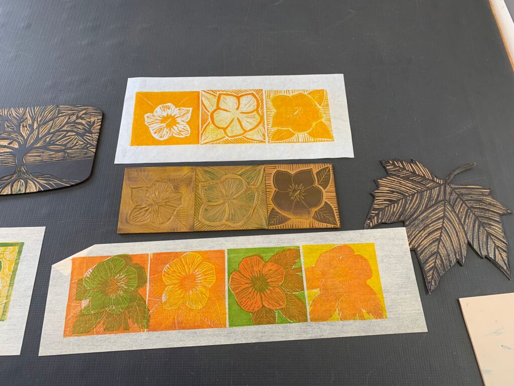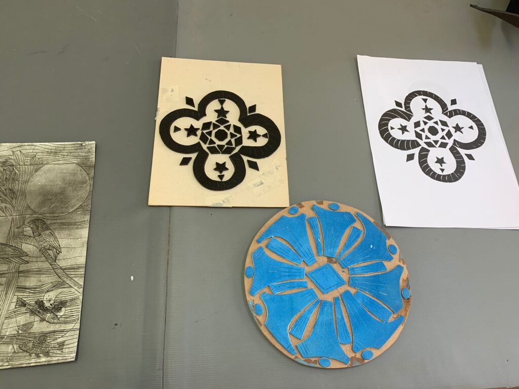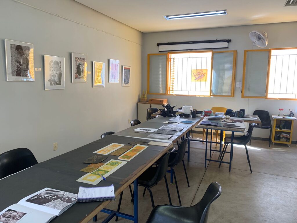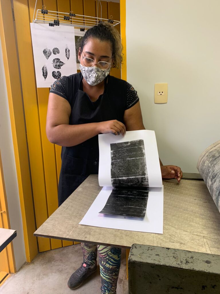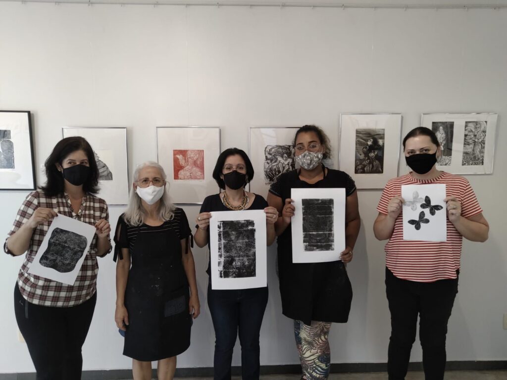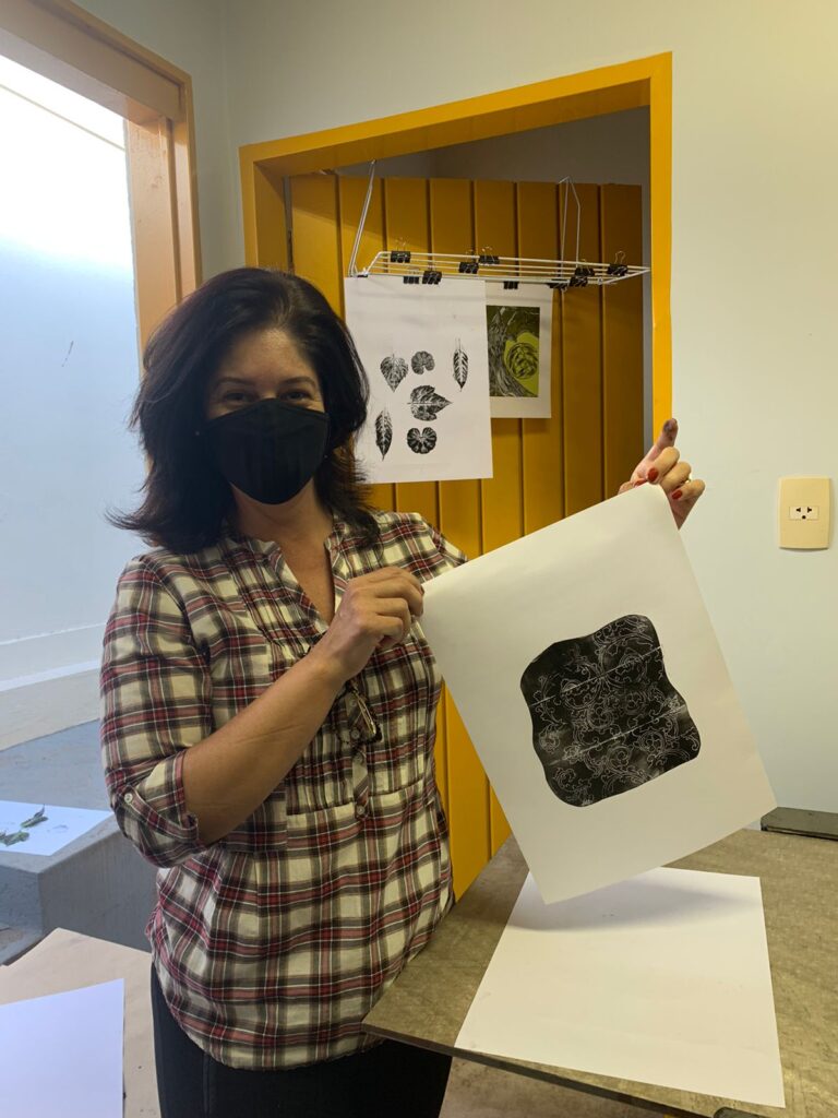 Como parte desse calendário de exposição, o LAB está promovendo oficinas gratuitas de gravura em tetrapak, uma alternativa sustentável, uma possibilidade de revelar talentos, habilidades e democratizar o fazer artístico. Quem quiser participar, pode se inscrever pelo telefone 16 3722-5004. As oficinas são realizadas durante 3 horas, em grupos de 4 pessoas e oferecem o passo a passo para a preparação da matriz, transferência do desenho e/ou texturas e, finalmente, a impressão, bem como o manejo e limpeza dos materiais, porque arte é sempre processo. Participei na última semana dessa oficina e fiquei encantada com a didática e com a acessibilidade da técnica mesmo para quem não possui habilidades de desenho. Compuseram a minha turma Ana Claudia Gomes Querino, dentista e artista plástica que trabalha com policromia barroca; Heloísa Reis Cintra, educadora, artesã, origamista e que eventualmente trabalha com restaurações e Letícia Maciel, estudante da área da Saúde e artista cênica. Uma bela iniciativa do Lab, em seu caráter agregador, sua grande marca.