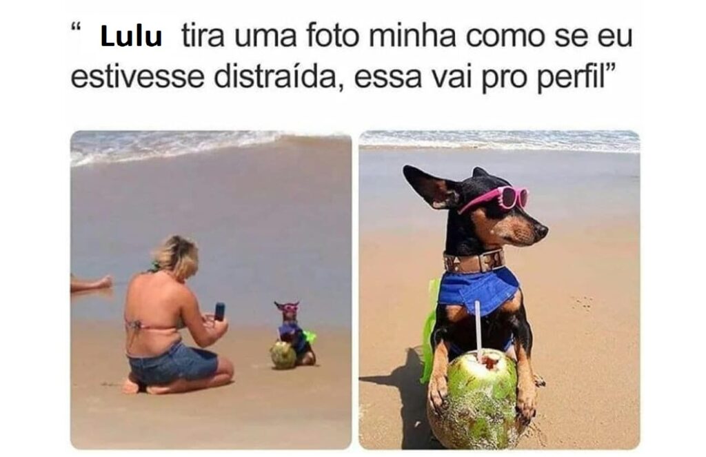 Chegamos, paramos num “kibosque” embaixo de um coqueiro. A primeira coisa que eu fiz foi tirar a “quenga” e correr pra água. Pus a mão e levei na boca para ver se era salgado mesmo. Pura “salmora” que a gente faz bochecho quando está com dor de “goela”. Vinha aquelas ondas e eu e a Lolosa nos deliciando (bebendo água, mas nos deliciando). Tobi ficou vigiando as coisas na mesa pra ninguém roubar.