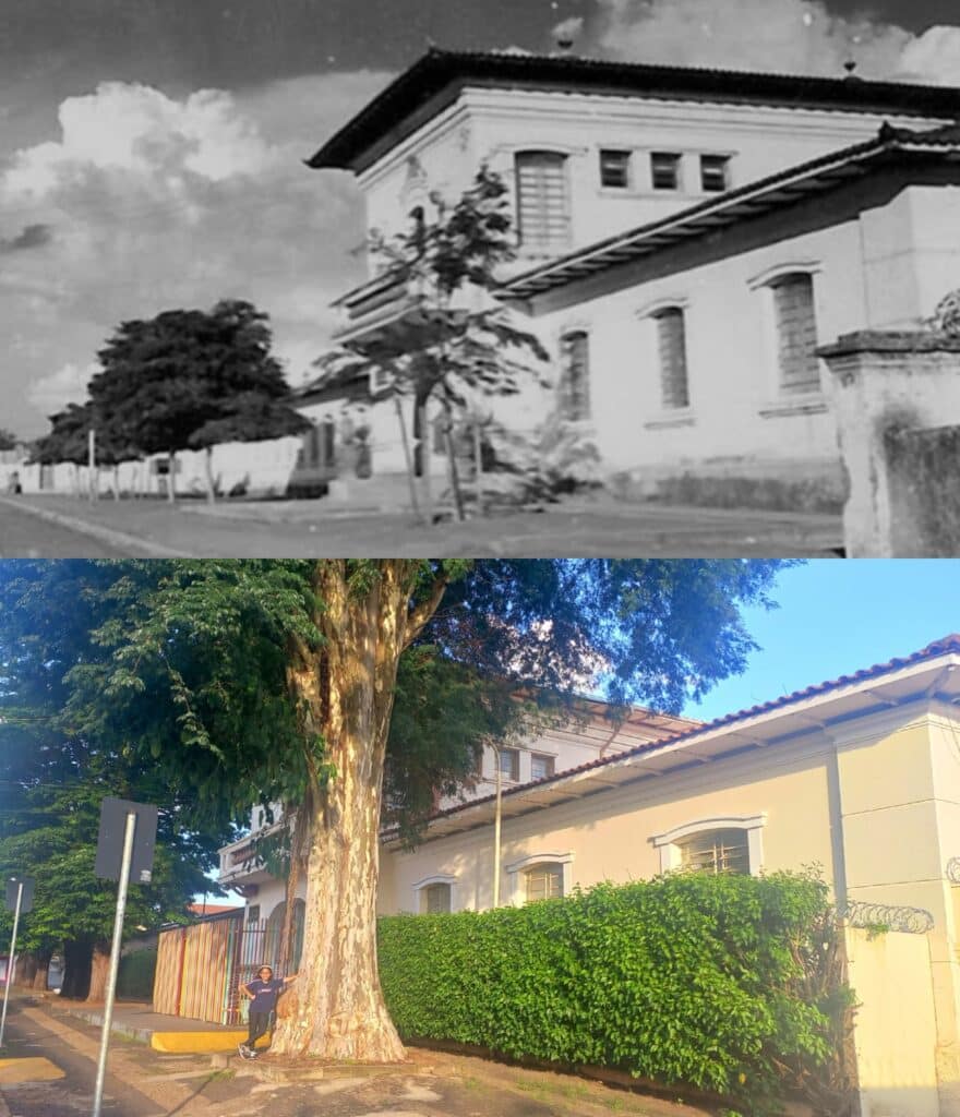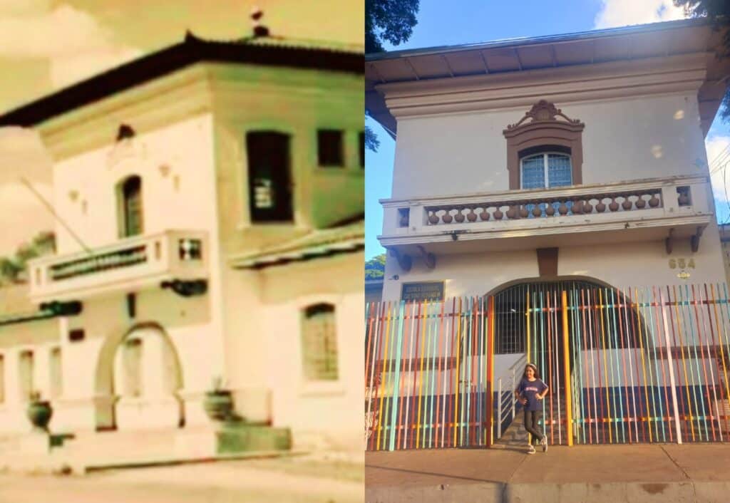 Naquela época, a escola era bem menor do que é hoje, não tinha todas as salas que existem agora, nem as grades coloridas no portão, e também não havia as árvores que cobrem a janela da escola para a rua.