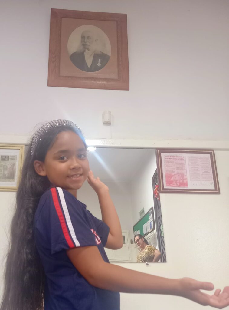 O jardim da escola é maravilhoso. Eu amo as gramas verdes e as árvores altas que fazem sombra, e tem uma fonte de água que não funciona mais, mas deixa o lugar tranquilo e bonito. Cada cantinho da escola me faz sentir acolhida. A escola também tem três corredores grandes, mas não são para correr! No meu primeiro dia de aula, pensei que eram, mas depois aprendi que são para andar até as salas de aula. Minha sala é grande e aconchegante. Eu sou amiga de todos e sempre tento ajudar quem precisa. Meu dia favorito é a semana da criança. Eu amo minha escola! Ela é um lugar onde me sinto feliz e onde posso aprender, brincar e crescer com meus amigos. E saber que minha escola é tão antiga e importante para a cidade me deixa ainda mais orgulhosa!