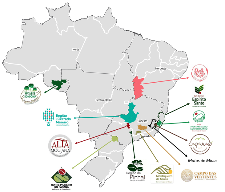 Das 88 indicações geográficas registradas no Brasil,13 são referentes a cafés, somando uma região produtora de 419 municípios nos estados de São Paulo, Minas Gerais, do Espírito Santo, de Rondônia, do Paraná e da Bahia. As 13 IGs representam 12 regiões do país, já que o Cerrado Mineiro está registrado nas duas modalidades: IP e DO.