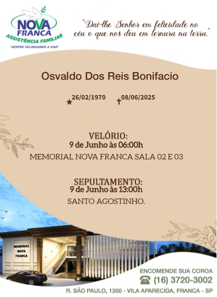 Com profundo pesar, comunicamos o falecimento do Pastor Osvaldo dos Reis Bonifácio, aos 55 anos de idade.