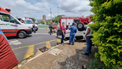 Motorista desrespeita parada obrigatória, atinge motociclista e capota carro perto do Hemocentro