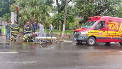 Motociclista não respeita parada obrigatória e fica ferido ao colidir com carro na Vila Aparecida