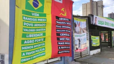 Painel afixado em comitê de candidato de direita que associa a esquerda a PCC, aborto e a narcotráfico gera polêmica