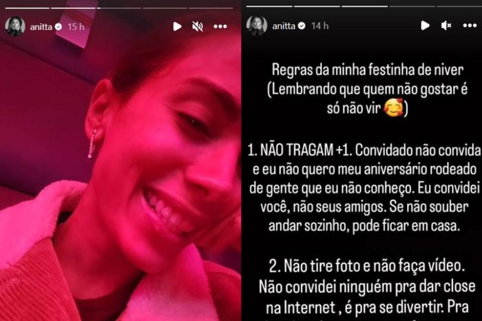 SÃO PAULO, SP (FOLHAPRESS) – Anitta divulgou, em publicações nos stories do Instagram, as regras de etiqueta para sua festa de aniversário. O evento, que ocorrerá na próxima sexta-feira (24) em São Paulo, promete reunir uma seleta lista de convidados aproveitando a realização do Lollapalooza. “Regras da minha festinha de niver (lembrando que quem não gostar é só não vir)”, começou a cantora, que está comemorando 30 anos.