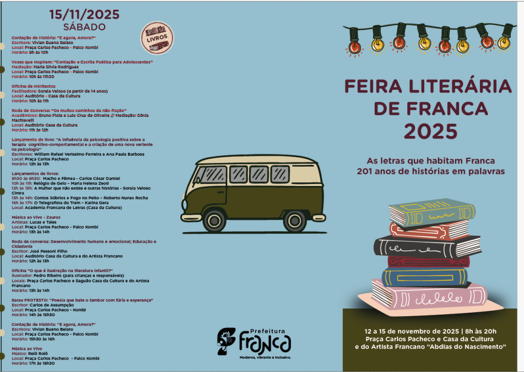 Entre os dias 12 e 15 de novembro, Franca celebra seus 201 anos de histórias em palavras com a realização da Feira Literária de Franca 2025. O evento ocupa dois dos principais espaços culturais da cidade — a Praça Carlos Pacheco e a Casa da Cultura e do Artista Francano “Abdias do Nascimento” — oferecendo uma programação intensa e gratuita voltada para todos os públicos.