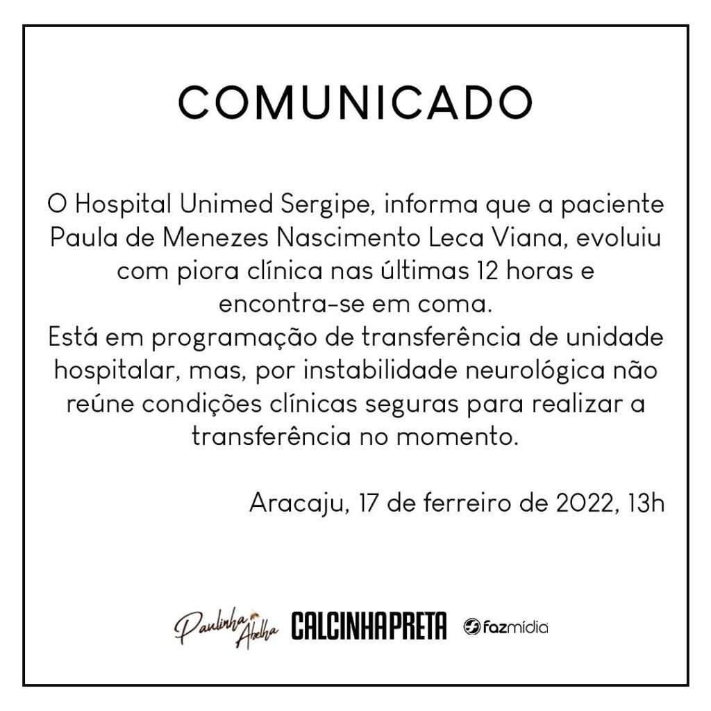 Internada desde o dia 13 por complicações no rim, a cantora Paulinha Abelha, 43, vocalista do grupo Calcinha Preta, teve uma piora em seu estado de saúde. De acordo com o mais recente boletim médico divulgado nas redes sociais da cantora, o hospital da Unimed Sergipe informa que a paciente “evoluiu com piora clínica nas últimas 12 horas e encontra-se em coma”.