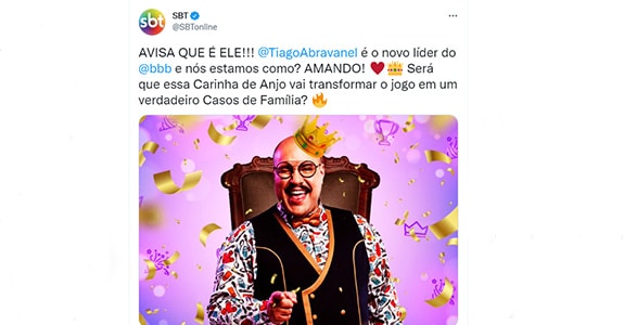 A brincadeira começou com uma publicação no perfil oficial do canal de Silvio Santos, avô de Abravanel. “Avisa que é ele! Tiago Abravanel é o novo líder do BBB e nós estamos como? Amando! Será que essa ‘Carinha de Anjo’ vai transformar o jogo em um verdadeiro Casos de Família?”, postou o SBT citando a novela e o programa da emissora.