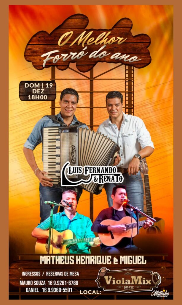 O Viola Mix Show trará no próximo dia 17 de dezembro, ás 21 horas, a dupla Zick e Zuck para uma noite sertaneja especial. Já no domingo 19, ás 18 horas, o público poderá curtir o melhor do forró, com a dupla Luis Fernando e Renato.